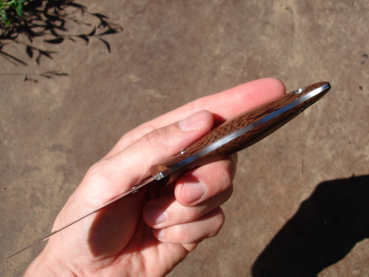 Про ножны пока не обговаривали :D Толщина, блин, нож уже отдал, но текстолит 10-миллиметровый, клинок 3 мм где-то, соответственно в самом толстом месте около 22-23 мм должно быть