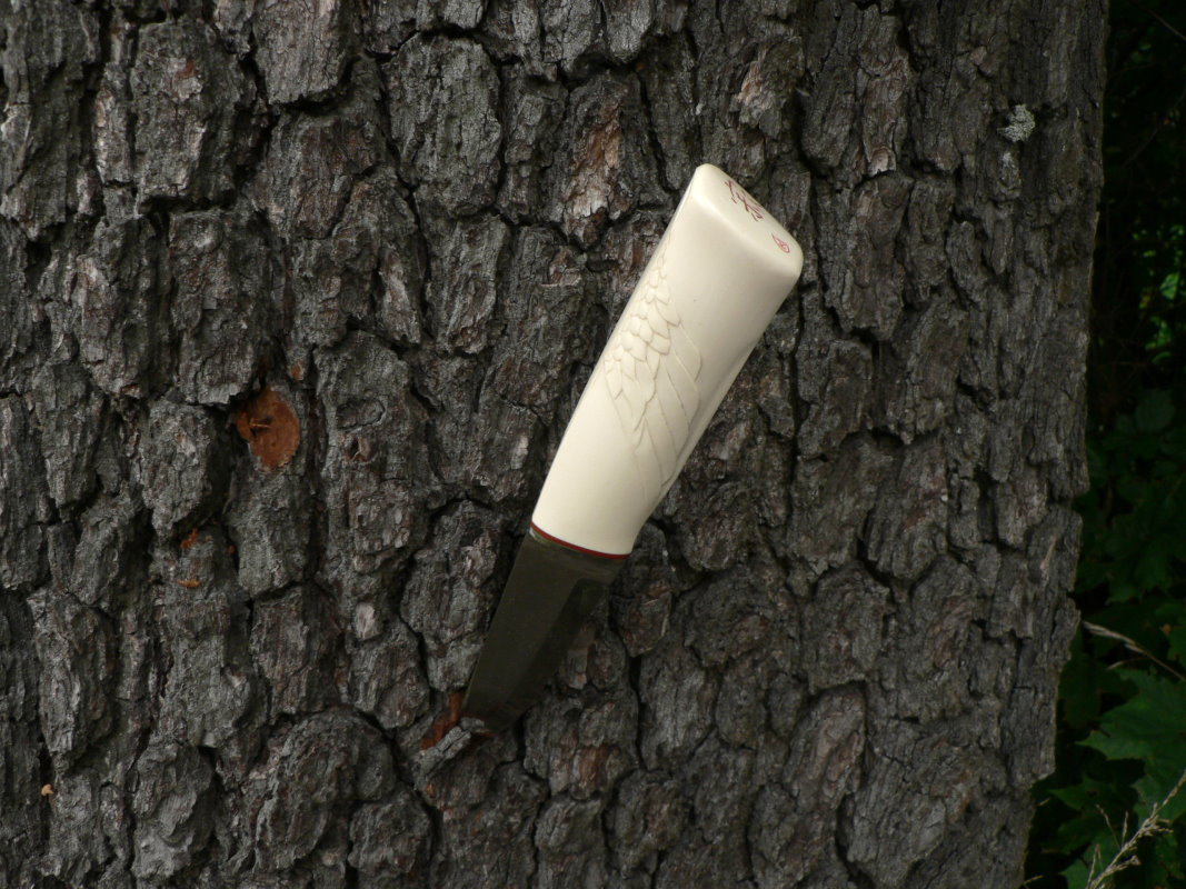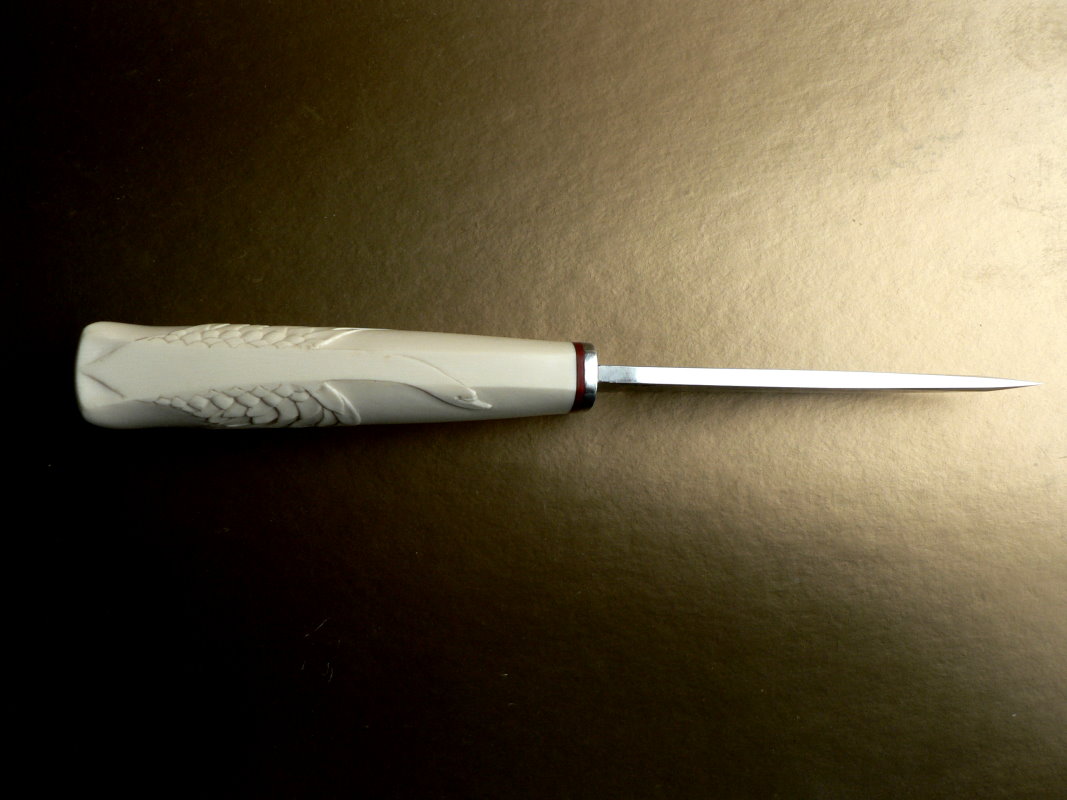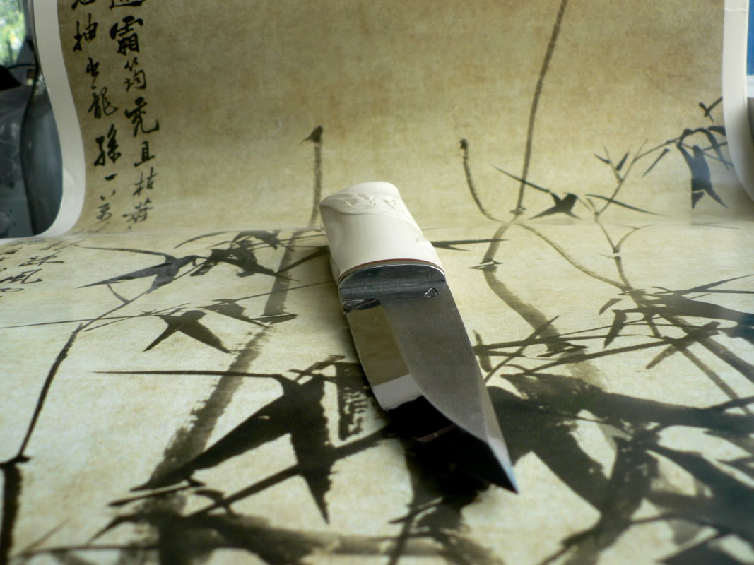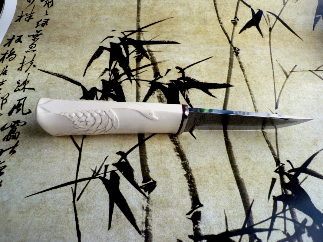 Теперь о рукояти: Использован бивень мамонта категории А. В резьбе пытался применить принцип дзэн искусства У-ВЭЙ, скупость и непроявленость линий.