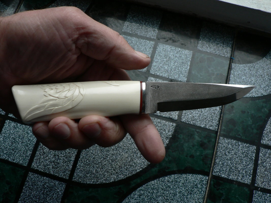 Привет! Очень приятная работа. Наверняка в руках еще круче чем на фото - тут как не фотографируй реального ощущения от клинка, а главное, от резьбы по бивню никак не передашь. Вещь уже художественного уровня!