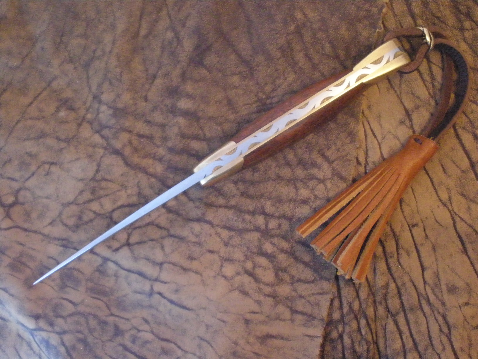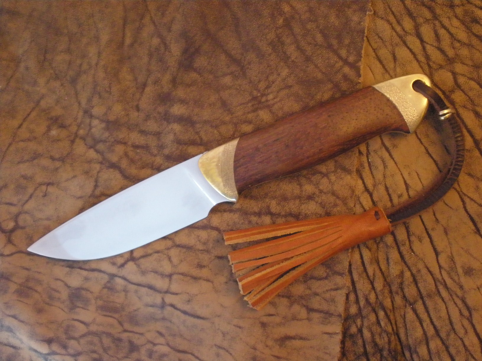 К сожалению, точные ТТХ не могу показать, по памяти: Общая длина где-то 200-210мм, ширина около 30 мм, толщина у больстера 4мм, спуски от обуха, двойной клин. Слесарка моя из кованой полосы 95Х18, фултанг, рукоять - латунь, ятоба. Ножны кожа, льняная вощеная нить, тиснение, пропитка обувным воском. Фурнитура на подвесе - слоновая кость (Надеюсь, Штабскапитан простит меня, остался небольшой кусочек при переделке рукояти трости в Леопарда :mrgreen: )