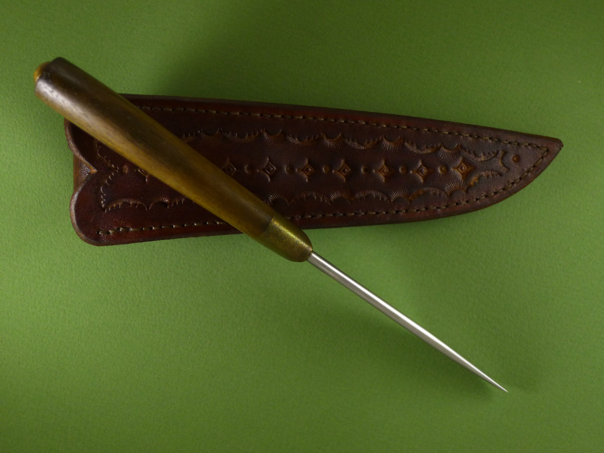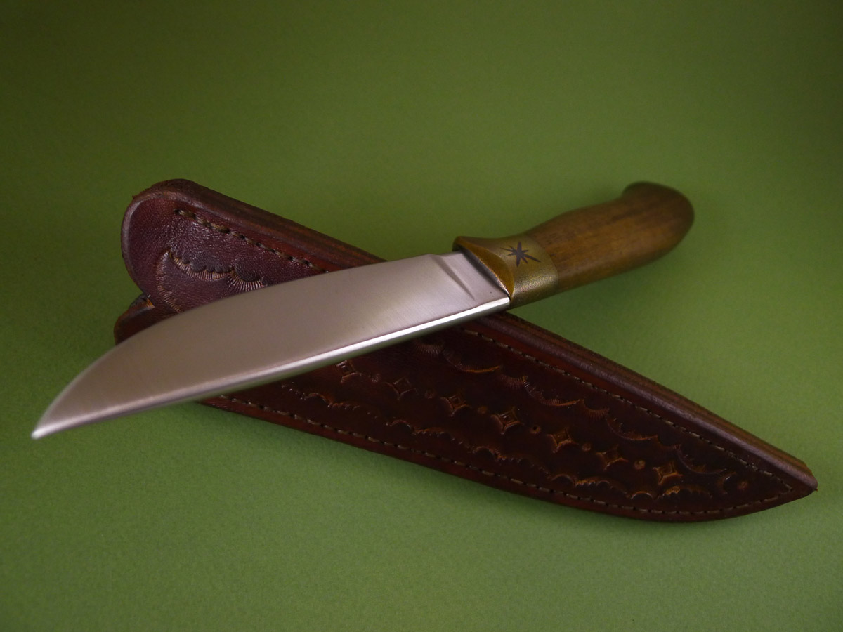 Бронза, орех, ножны кожа, клинок кованый,свой, твёрдость 58-59HRC.