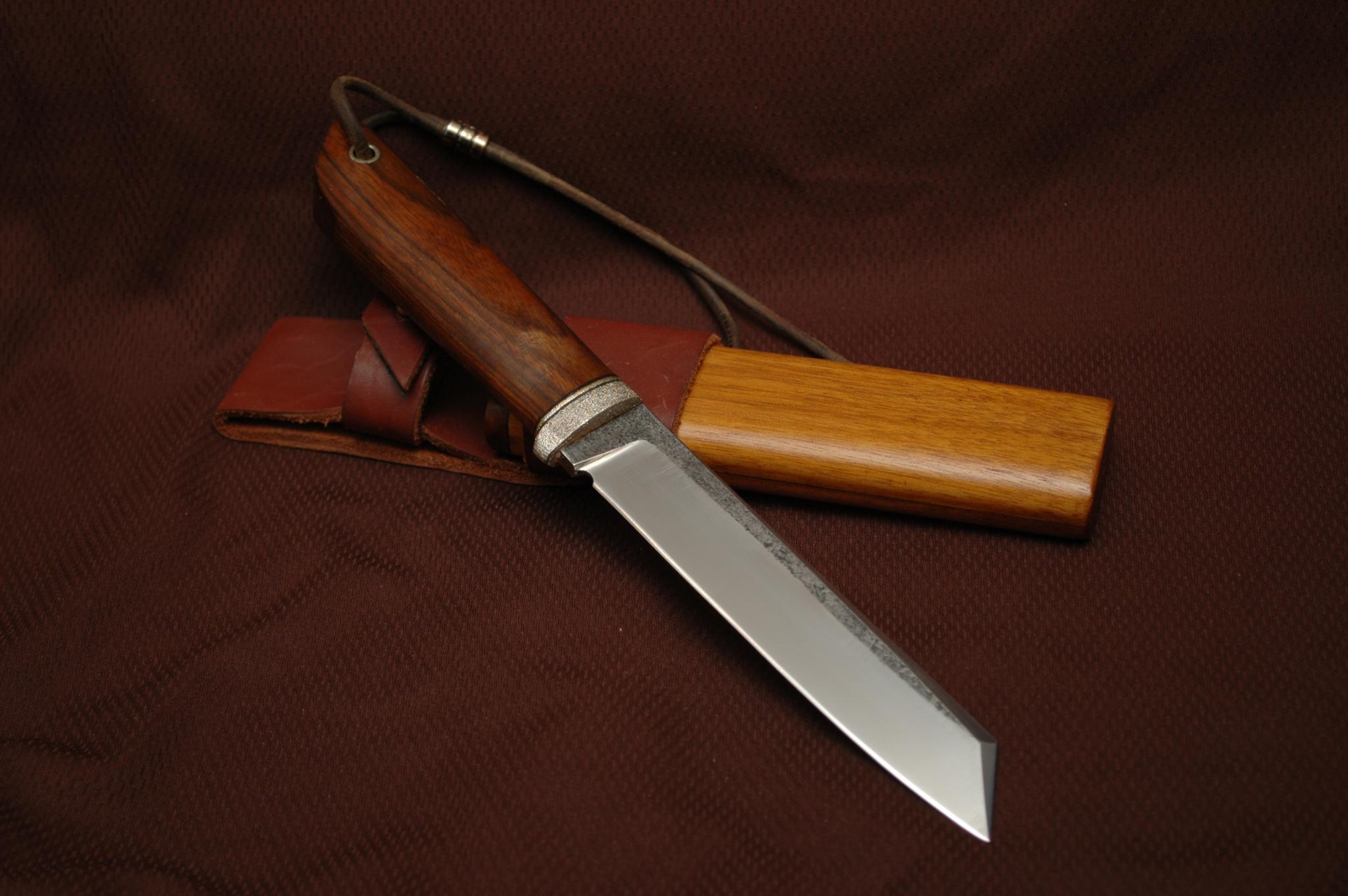 Доброго время суток! вот получился нож- " в японском стиле" Клинок Х12МФ. закален 58-59 ед. больстер - никель, рукоять- орех. Ножны- орех, кожа.