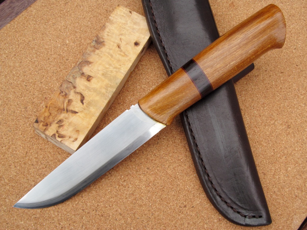 Этот ножик из предпоследних. Тоже с клинком от Хелле и "неликвида". Поскольку клинки от Хелле царапаются от взгляда, ножик как-бы рабочий - т.е. на рукоять пошло что было непонятно то-ли использовать, то-ли вообще выбросить. В данном случае: просто прямой кусок акации. Ну и обрезок Индийского палисандра от чего-то, что делал ранее. Клинок Бракар: я его слегка обточил с обуха и слегка укоротил, добавив широкий конец к хвостовику - уж больно родной у него дурацкий - идет тонким прямо от клинка.... Поскольку по-ширине клинок тоже сократился, пропорции как будто сохранились и клинок смотрится почти как-будто и не делалось с ним ничего. Длинна, наверное, миллиметров 115 - 120. Ну а так - все на фотках.