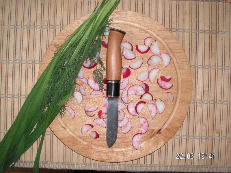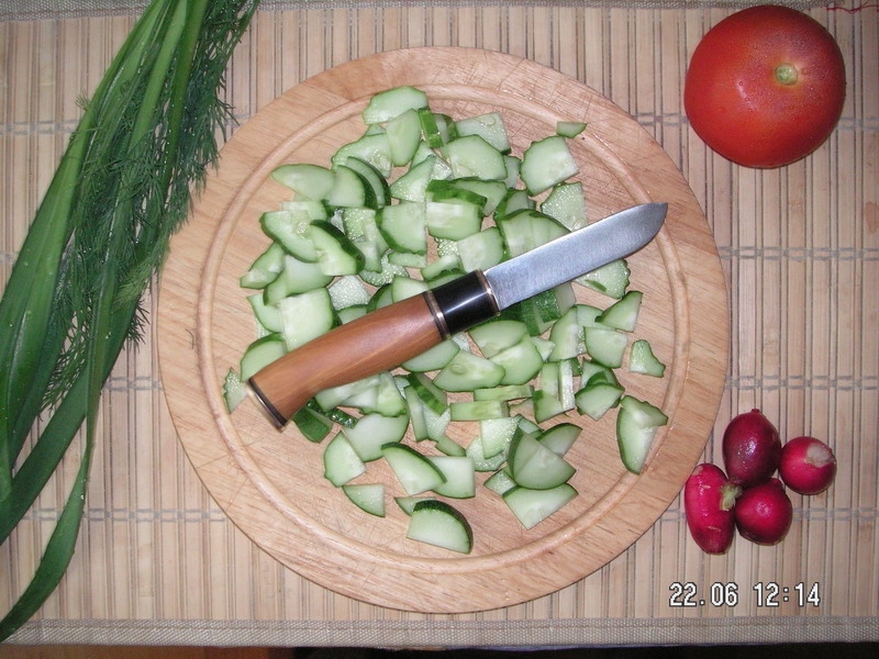 В прошлый раз, когда представлял свою самоделку, резал канат. Теперь решил нарезать салат.