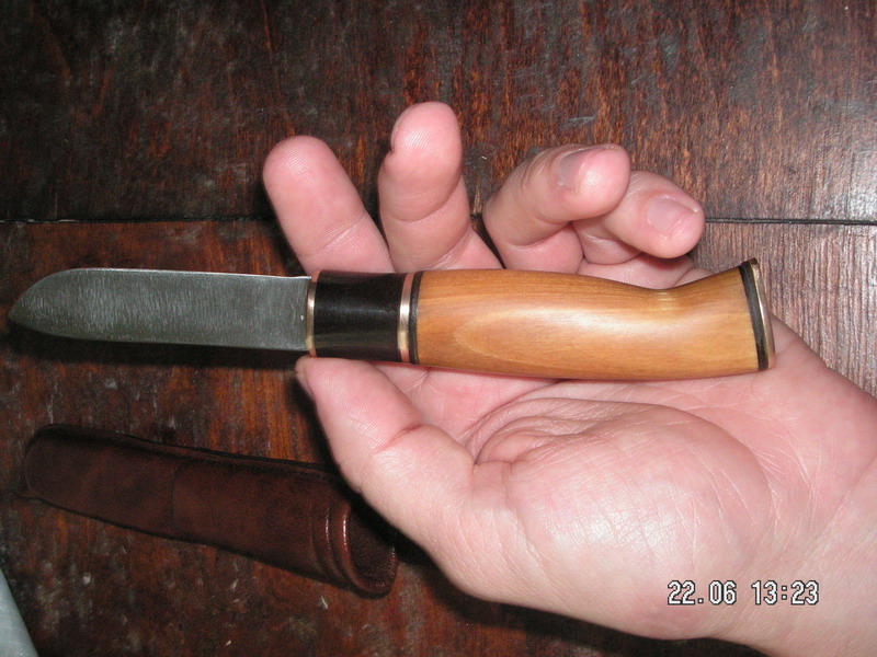 Нож приятный. Форма рукояти даже на вид весьма удобна. Оставляет вопрос лишь форма лезвия... Мне кажется что при заточке будет несколько неудобно. Хотя наверное это дело опыта. Например своего первенца после попытки заточить пришлось снова в мастерскую... на переточку геометрии.