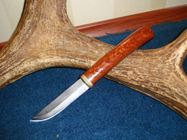 Спасибо. До практики очень мало и времени. Но буду стараться. А что касается формы мне тоже не нравиться но повторюсь это тренировка на нормальной деревяхе. Латунь с проставками опять же... А что касается удобства в руке то с этим все нормально. Да и как нож для всякого ( деревяшку построгать, банку открыть) подойдет.