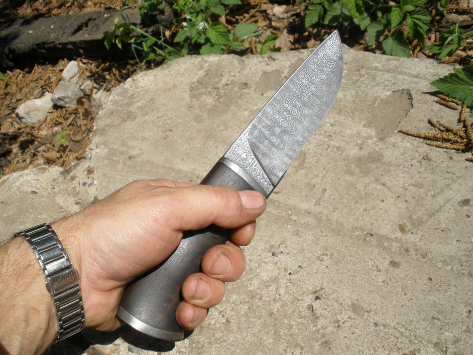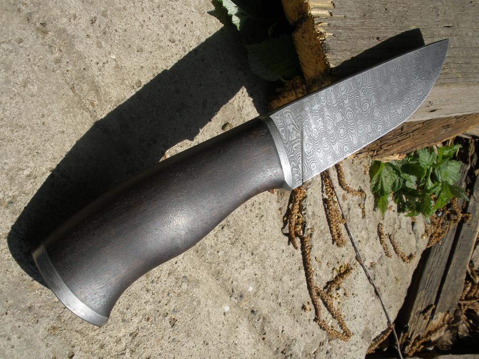 Здравствуйте коллеги,сочувствующие,понимающие и не очень.Разрешите представить вашему вниманию ,ну и ессно для критики ,последнюю работу на заказ.Клинок дамаск Мастерской Федотова,палисандр их же,гарда и тыльник - федотовский.Проба работы с дамасковыми фурнитурками-мне понравилось,не так уж и заглаумно,есть конечно некоторые нюансы,но терпимо.ТТХ: клин 145*40*4 ,рукоять 120,больстерок 17*40,тыльник 40*24.Как-то так.Ножны будут простые,с подвесом(бюджет).