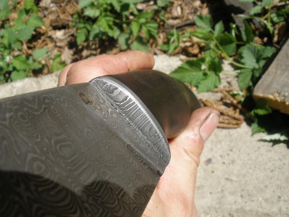 Гарда была протравлена окончательно перед сборкой ,обмотана малярным скотчем(для предохранения от рисок) ,а вот тыльник ...с ним погеморнее,изнутри приварены 2 мощных штифта с засечками ,и после этого тыльник закалён ,для лучшего проявления рисунка при травлении.Ну и обдирка ,без прижёгов,.После окончательного довода рукояти по формам и размерам,она отполирована ,намаслена (полошным) и накарнаублена,а вот чтобы азотка не повлияла на дрова по краю дамаска (со стороны дерева)наклеивается маляроскотч...и в кислоту.И поаккуратней,шкуркой не задеть дерево.Всё просто и доступно.Монтаж клинка в рукоять-втыкушка на 90 мм.Как-то вот так.