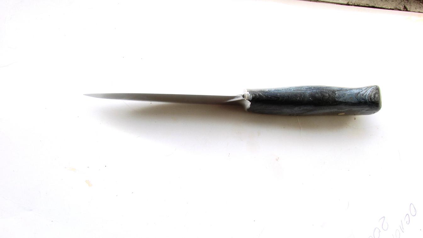 Он для тестов делался,строго по тех.заданию и с рукоятью попадающей под накладной монтаж,РК до 0,5 то есть в 0,сталь пластичная но твердая,вес в 130кг выдерживает,царапает стекло но без фанатизма,при боковых нагрузках РК пружинит на грани загибания,правится в два движения как финка,клин - классика брака но сам нож тяжеловат.Вроде все.