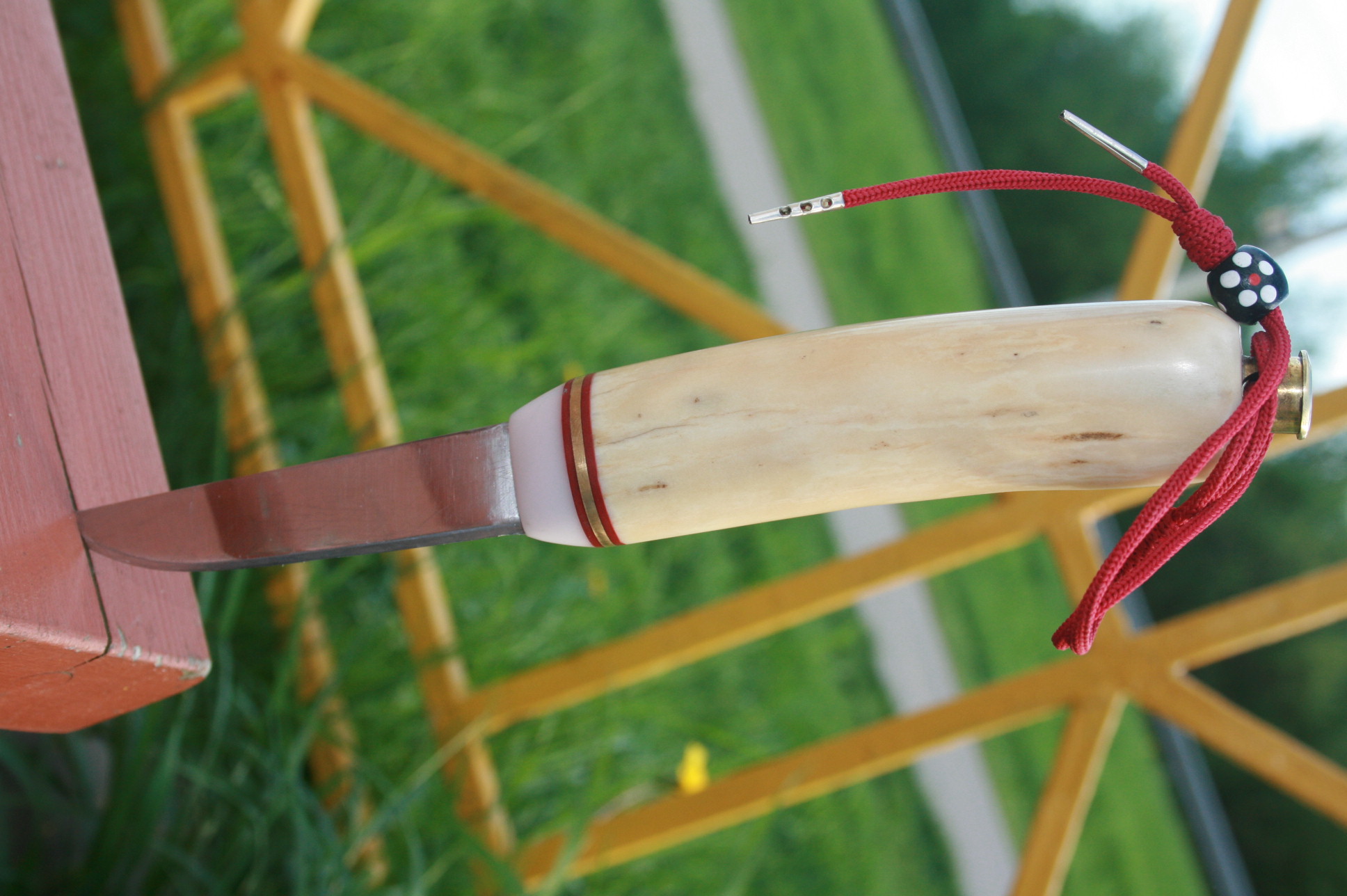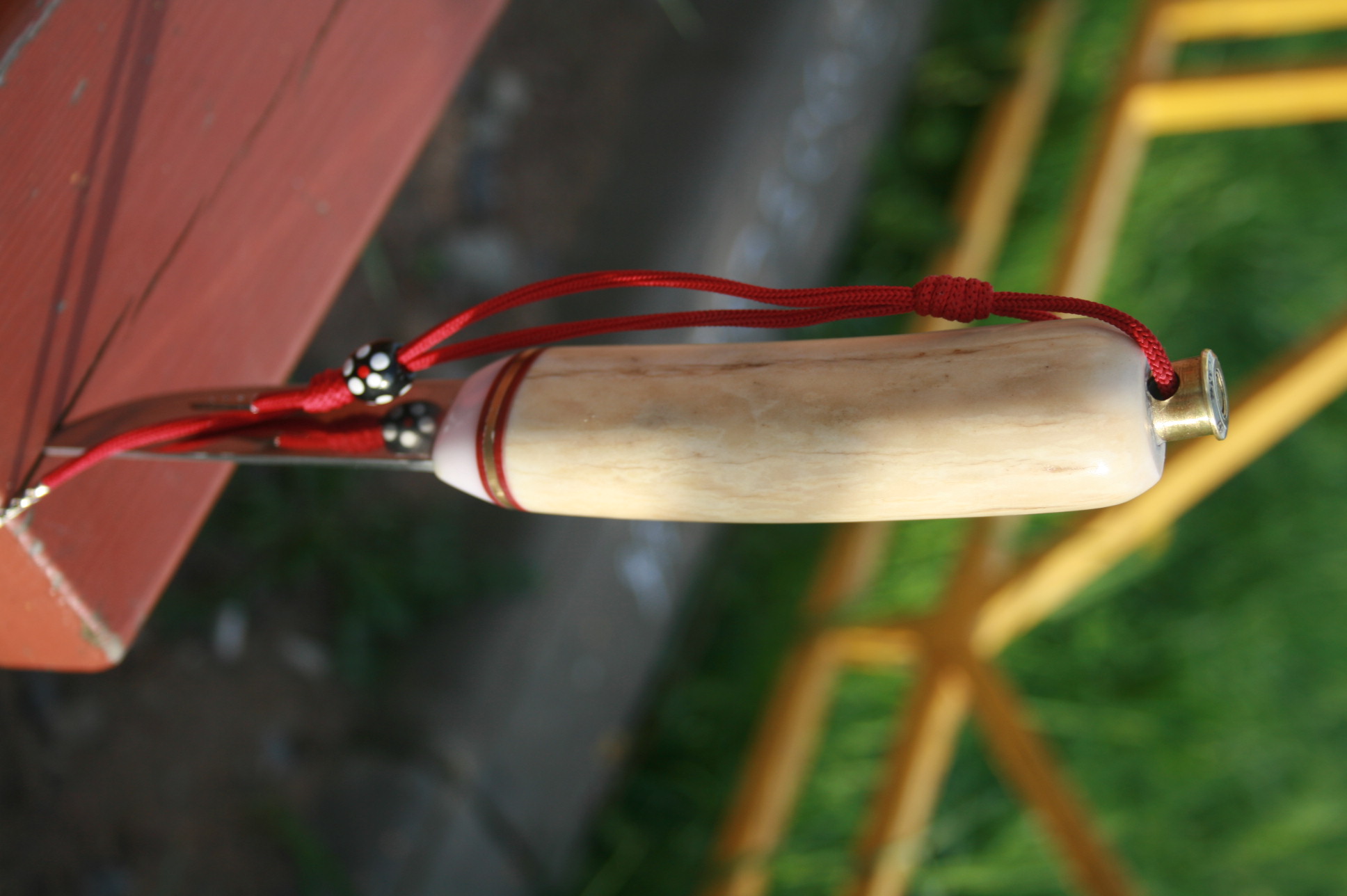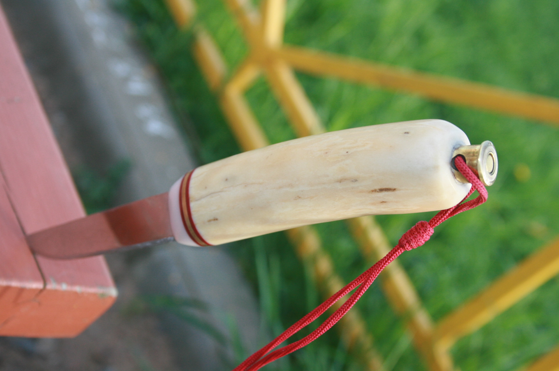 Александру)красная фибра,латунь,рог лося полированный карнаубским воском.Монтаж всадной на эпоксидку,расклеп на гайку,мозаичный пин из гильзы,темляк – шнур капроновый с бамбуковой бусиной.