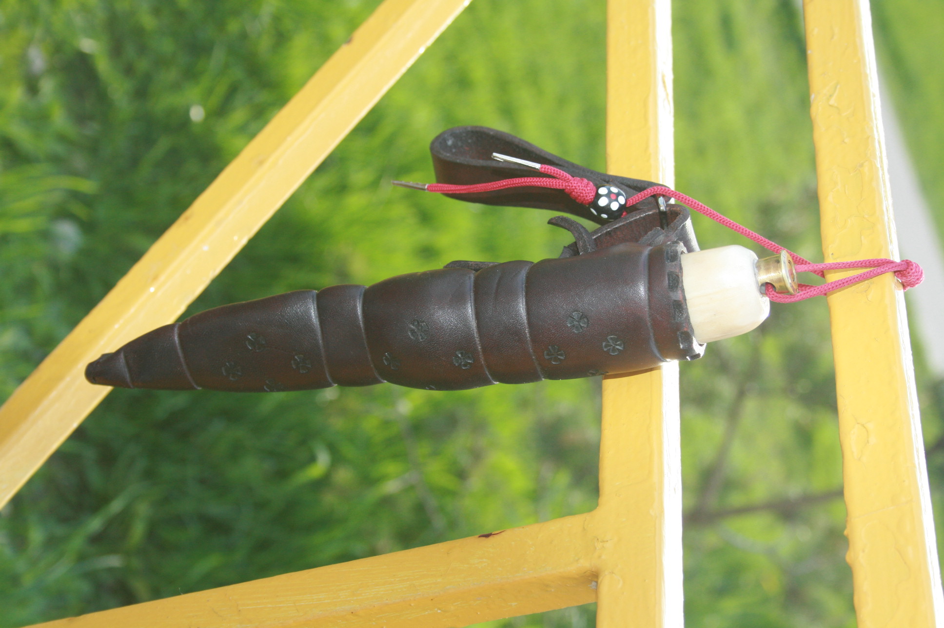 Ножны со свободным подвесом,кожа 3,5 мм,седельно-шорная,краска КИВИ,нитки капроновые вощеные,вкладыш эпокса армированная бинтом.Ножны провощены пчелинным воском.Нанесен незатейливый рисунок.