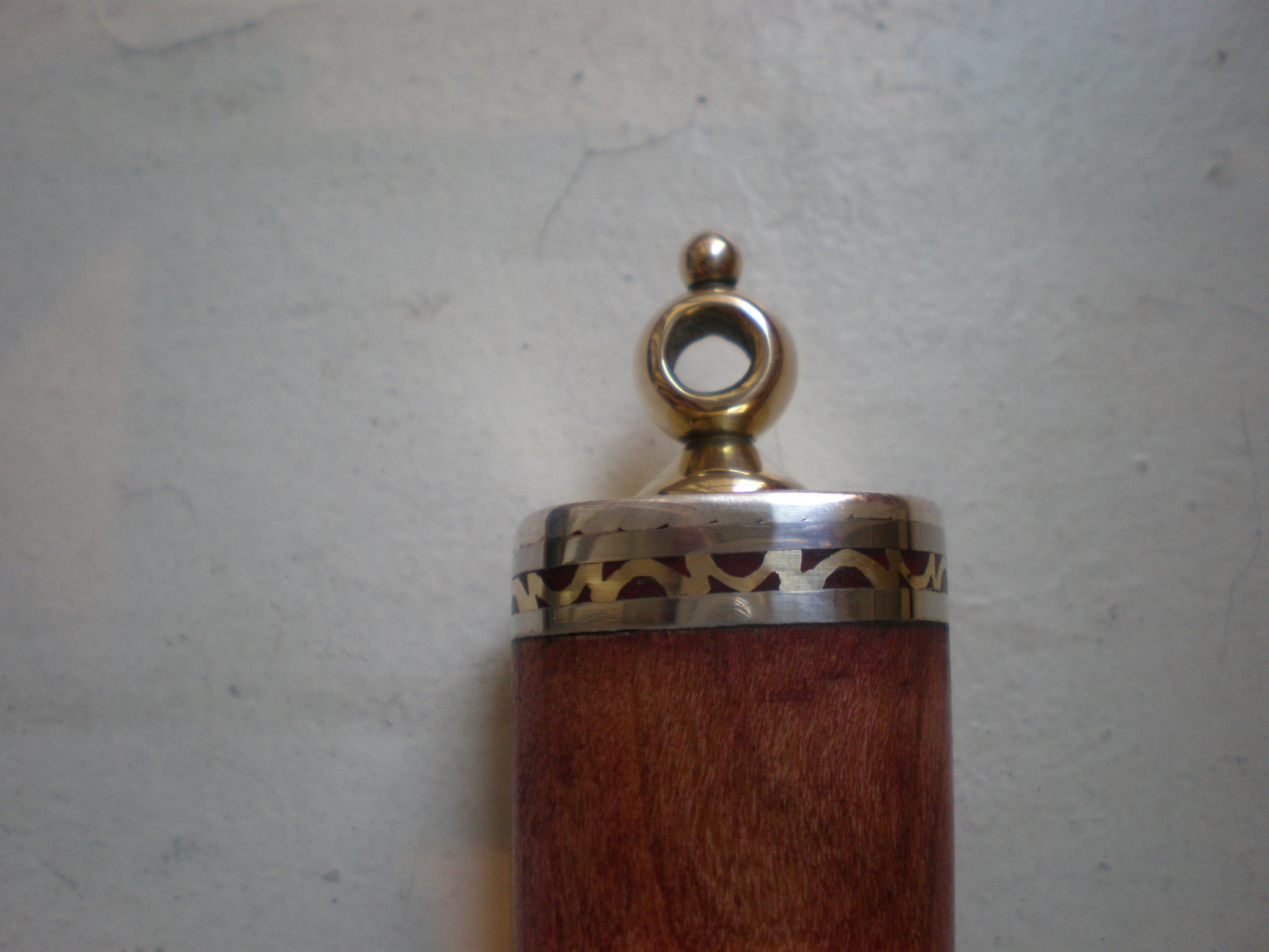 Тыльник крепится к рукояти двумя саморезами, которые закрываются латунной крышкой с темлячной приблудой. Крышка крепится по ювелирному - обжата, как камень серебряным кастом-оправой. Под рукой была готовая серебрянная прокатанная веревочка, Припаял ее к тыльнику, крышку обжал, а рельеф сточил, он был немного лишний, на мой взгляд.