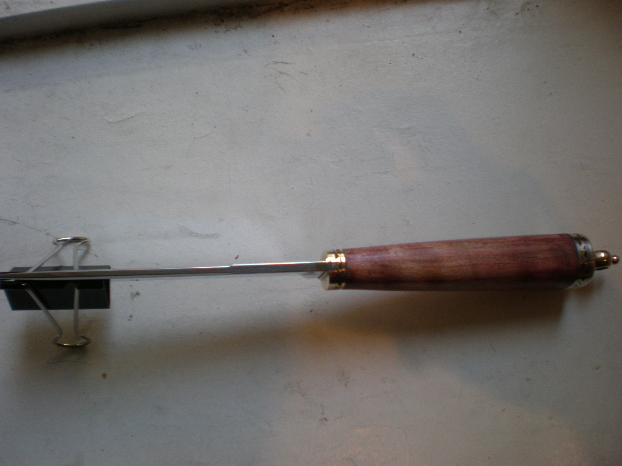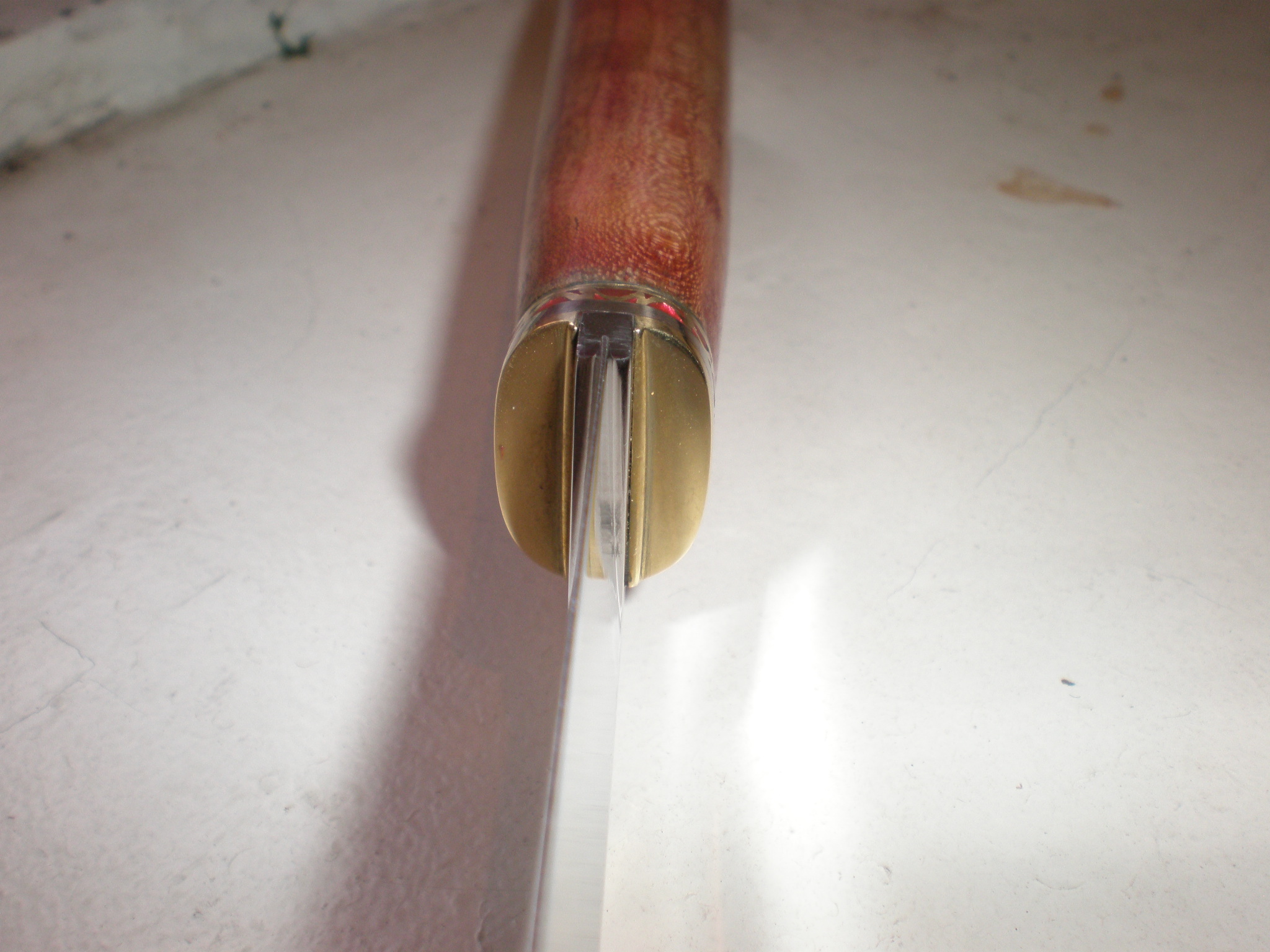 Фурнитура - латунь, мельхиор. Рукоять - вишня, стабилизирована в вакууме в шеллаке, чуть-чуть морилки, восково-канифольная мастика. Пока не заточен, наточу, как ножны пошью.