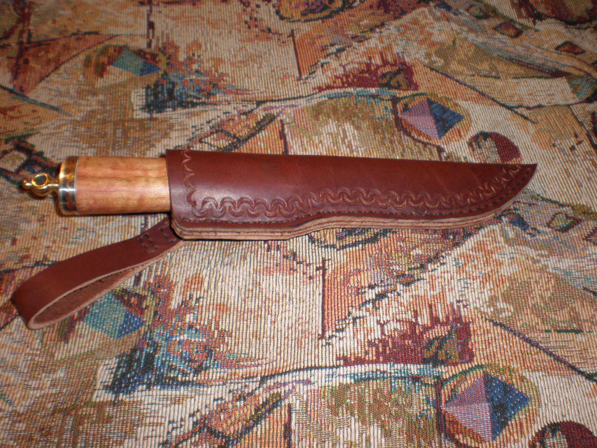 Приятный нож. Все в тему. Особенно больстер понравился. Навершие тоже, хотя и погрубее, кажется, сделано. А вообще, хорошая работа и эстетически приятная.