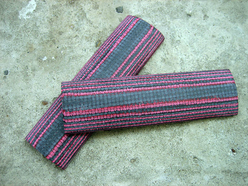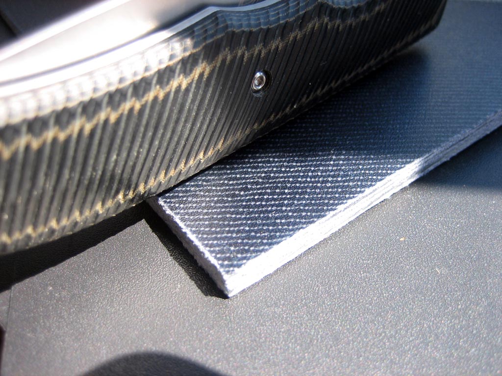 Ну вот и фото "шершавой :) " микарты: основа нейлон крупного плетения (от флага), 40 слоев, общая толщина накладки 6 мм (чтоб был понятен масштаб на фото - шляпка винта 5 мм в диаметре, толщина клина 1,9 мм). Технология проста - клеим пакет из тканевых полос боксидкой разведенной 1 к 10, через сутки вынимаем из пресса и аккуратно подцепив ножом самый верхний слой пакета как шкуру змеи его снимаем. Стоит ометить что получившаяся таким образом нейлоновая микарта представляет из себя такую упруго-эластичную массу, наподобии твердого полиуретана, поэтому верхний слой снимается достсточно легко. Для окончательного отвердевания я ее поместил в полиэтиленовый пакет и в течении часа поварил в кипятке. Результат мне очень понравился - нескользкая даже в воде поверхность. Единственное НО, флаг был алым, а микарта получилясь иссиня-бордовой, вот как то так :| :