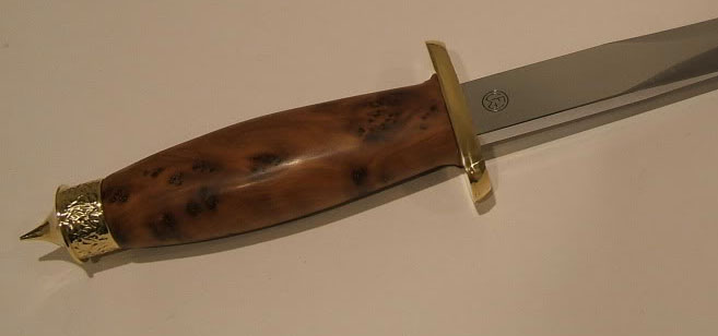 Кинжал (кинжал ли :shock: ). Нож, с кинжальной формой заточки клинка, понравился, но есть несколько моментов: во первых, такое острое навершие - даже для "полочника" не очень желательно и при такой длине клинка, у рукояти баланс будет явно в сторону клинка, значит более массивное навершие необходимо...
