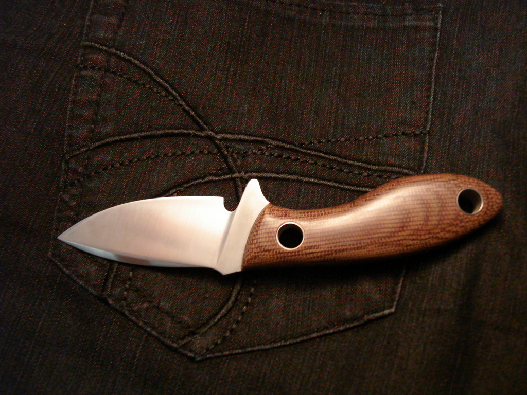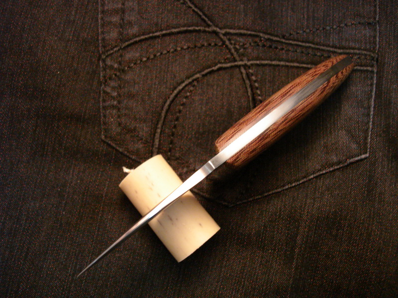 Ну вот брат для предыдущего ножа родился (да простит меня уважаемый Том Крейн за копирование форм его ножей), удобоносимого, так сказать, размера. Сталь углеродка - кусок совпищепромовского поварского ножа, твердость ХЗ (надфиль цепляет но крайне неохотно, сверлил твердосплавным сверлом)