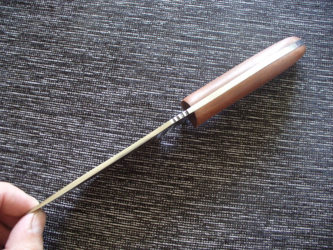 Сталь ШХ15. Рукоять неизвестное красное дерево. темлячное отверстие медная трубка. Накладной монтаж ручки по учению деда Димона.