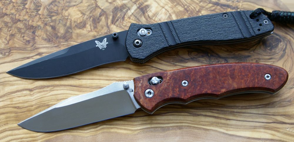 Оба хороши, но СНЭЧ в таком исполнении выглядит наряднее, всё таки дерево очень удачное. BM710 - работяга, ему понты ни к чему. А по форме и гармоничности дизайна они наравне, ИМХО. Сталь Х12МФ.