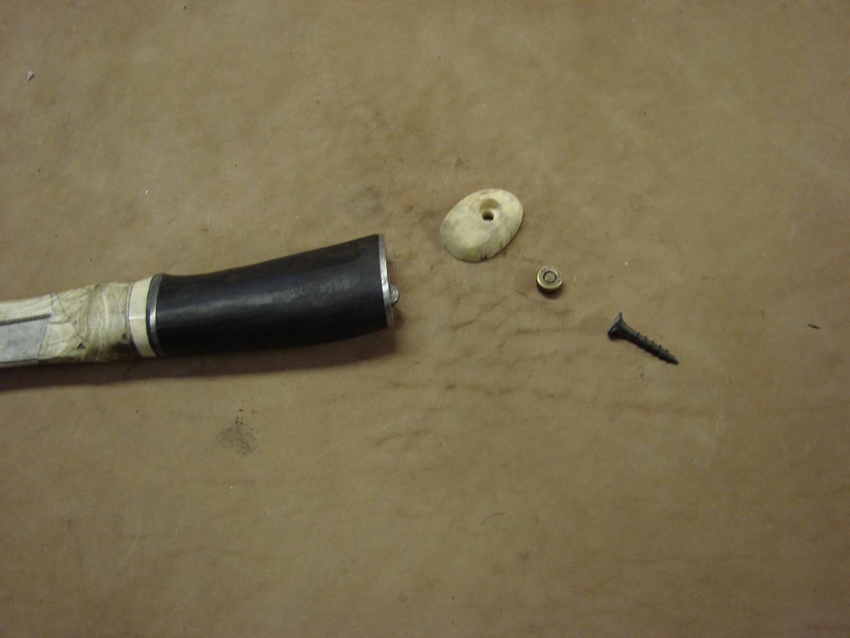 Да никакой загадки! Металлический тыльник фиксирует хвостовик, роговой фальштыльник, который маскирует крепление ххвостовика крепится саморезом в просверленное в рукояти отверстие меньшего диаметра, головка самореза прикрывается заглушкой