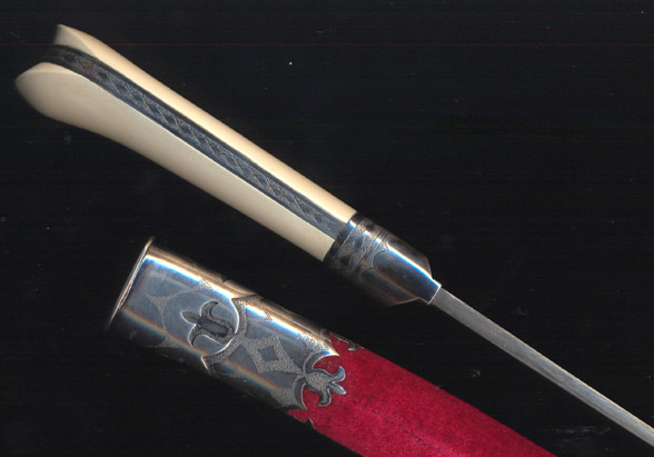 Оковки самодельные из латуни, посеребрённые, я даже не знаю, что такое ПР? Ножны из дерева, обтянутые. Насчет сабли Просвита ничего не скажу, не знаю такого, значки и сейчас собираю, но такого нет, форму передрал из книги ... догадайтесь с трех раз - "ХО в РЭМ", ессно, чтоб далеко не ходить.