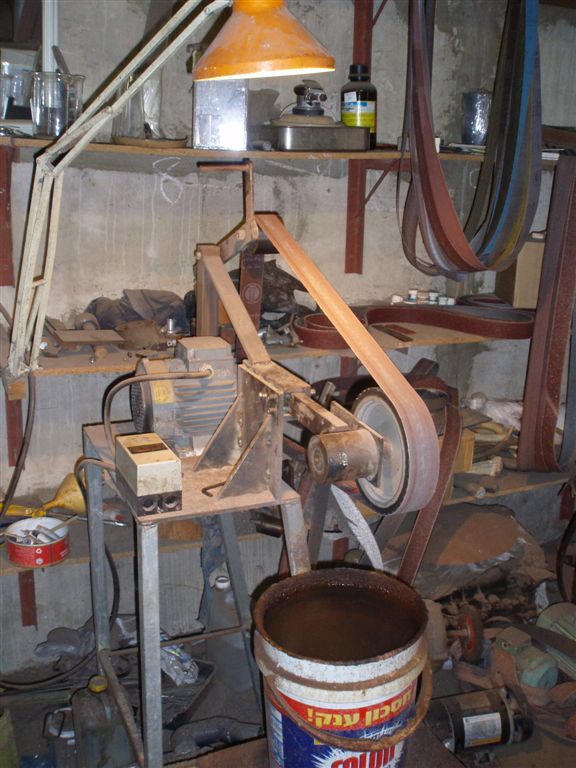 Неспешно проходим первый круг .Вижу все необходимое -горн ,печки для закалки разных размеров , духовка для отпуска ,пневмомолот ,фрезерный и токарный станки, ленточный гриндер собственного изготовления (Руди делает их и на заказ ) , вальцы и другие столь необходимые мастеру предметы .