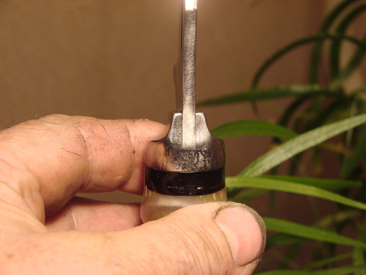 Типа устье узкое?Так оно той ширины чтоб клин кожу не резал :wink: фиксируется за канавку в роге,вставка деревянная.