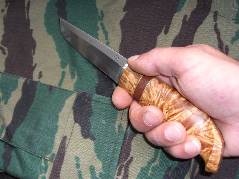 Больстер нейзильбер 5мм.Берёзовый кап,центр.Длина рукояти 125мм.Остального не помню уже.Нож продал за 12 тыщ.Без торга.Расчитывал на 8 - край. :lol: