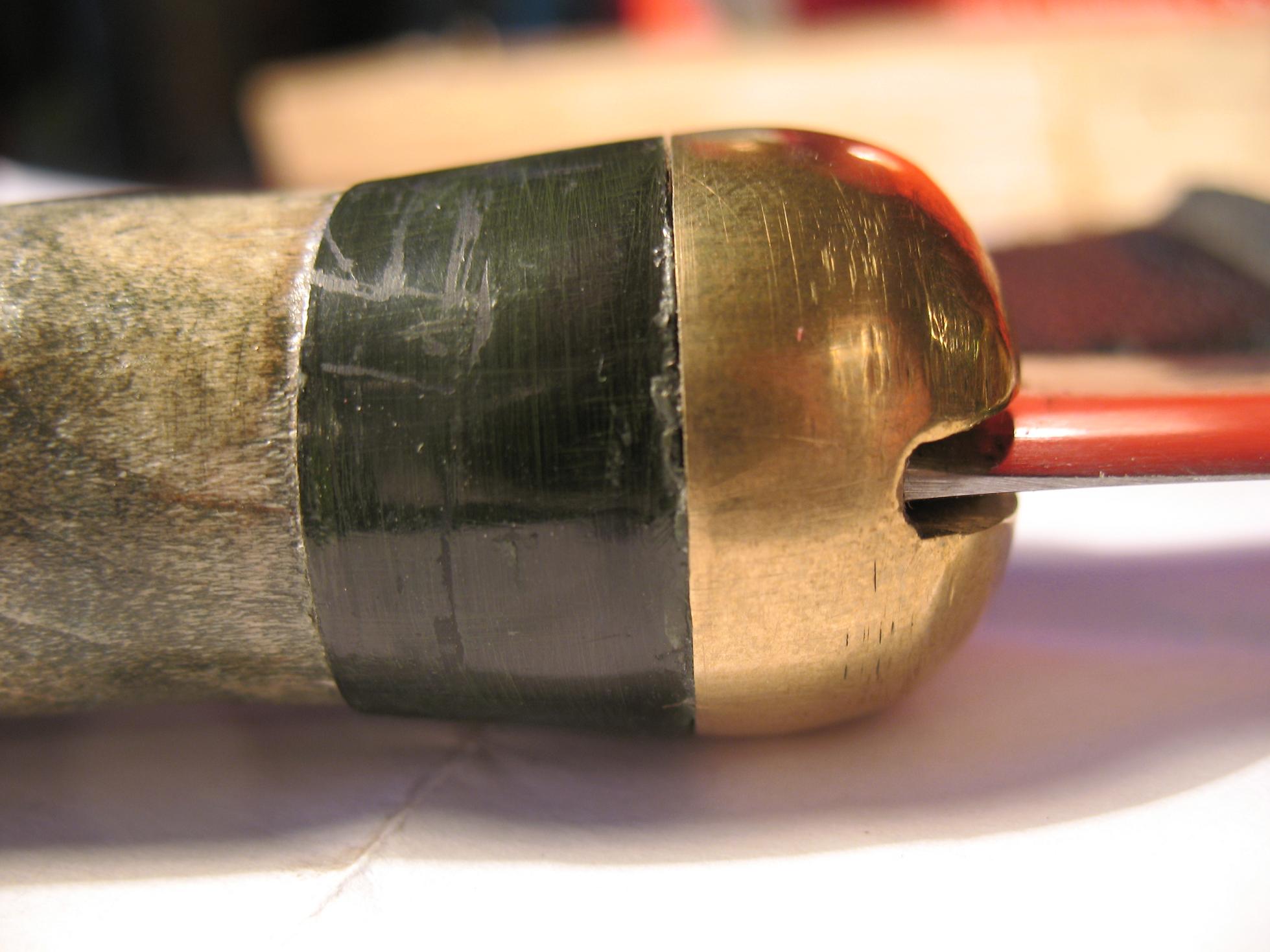 СТЕРЖЕНЬ. Со стержнем, я думаю, у нас с Вами проблем не будет. Это - пруток, желательно из малоуглеродистой стали, диаметром 10-12мм. С одной стороны режем резьбу М10 или М12 (в зависимости от диаметра стержня), а с другой необходимо сделать паз и отверстие. Пазуем на такую глубину, чтобы при прохождении хвостовика через гарду и соединении клинка со стержнем как можно меньше "люфтовало". Отверстие надо просверлить под соединительный штифт, который впоследствии необходимо (слегка!!!) расклепать. Штифт изготавливаем опять же из малоуглеродистой стали (можно использовать простой гвоздь). А вот сверлить отверстие в хвостовике клинка - твердосплавным сверлом - я советую после предварительной сборки. Если паз в стержне будет великоват - перед сборкой можно слегка сплющить "вилку" стержня.