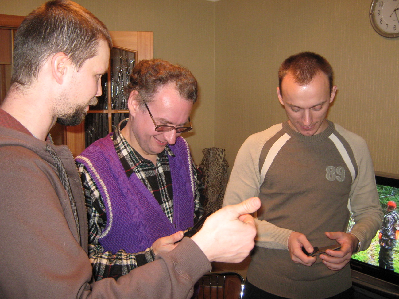 Ножей было достаточно для того, чтобы на протяжении нескольких часов народ с неослабевающим интересом их рассматривал. Леша Самоделкин выложил их все на стол и сфоткал рядом с линейкой. Сил публиковать гигабайты фоток, боюсь, у меня не хватит, так что пусть мой отчет дополняют своими фотками остальные ребята. А пока двинемся дальше и я немного расскажу и покажу соратников по партии...