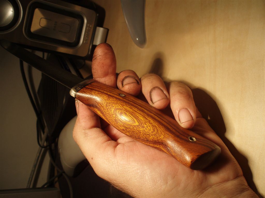 Олег ,клей не убран , нож не заточен , ножны не пошиты , после заточки попробую в работе и может чего еще подправлю . Можешь критиковать , вдруг сгодиться . :D