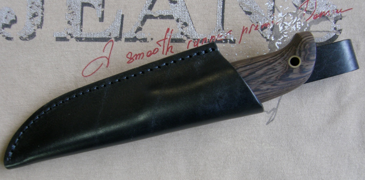 А вот собствнно и виновник обзора: Ф-11 АСГАРД с лимитовым клинком из CPM S30V. Нож выполнен в четко выдержанном скандинавсом стиле, клинок "дроп пойнт" длинной 118мм, шириной 25 и толщиной в обухе 3.5мм. Спуски прямые, лезвие без покрытия, но с абразивной обработкой, что делает клинок всегда опрятным (не остаются пальцы как на зеркалке) На левой стороне клинка лазерная гравировка логотипа и марки стали. Рукоять выполнена из дерева венге, больстер бронзовый, между ним и венге тонкая декоративная красная полимерная прокладка - мелочь, а приятно! В тыльной части рукояти отверстие под темляк, бронзовая трубка D5мм. Общая длинна ножа 225мм, ножны погружные (нож-то финский) из толстой черной кожи, подвес свободный. Нож сидит в них плотно, в перевернутом положении не вытрясти, но извлекается рукой свободно. Если нож сравнить с Чебурковым Шквалом, о котором был обзор, то по качеству отделки больдстера, обработке венге, полировки клинка...явно не джентельмен в смокинге. Его можно сравнить с питбулем - упорный, крепкий и агрессивный. Особо отмечаю четко выверенную эргономику рукояти, резать им просто какой-то экстаз!