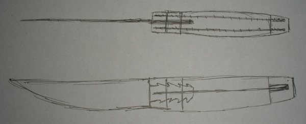 Признаюсь честно... не доходит, там хвостовик, он там вообще короткий... этот ножик первый же. ну дык и не стал сразу нормальный клин на него использовать (да и нет нормального :D) ну и проверить прочность конструкции которая получилось интресно было проверить. Вот попытался на бумаге изобразить эту хрень которую я замутил... Только не смеяться, и не обзываться... Сам знаю что прочность конструкции оставляет.... да нифига не оставяет... В общем отмазка одна - "У меня в семье нет Стивенов Сигалов которые кухонные ножи в темечко злодеям втыкают"