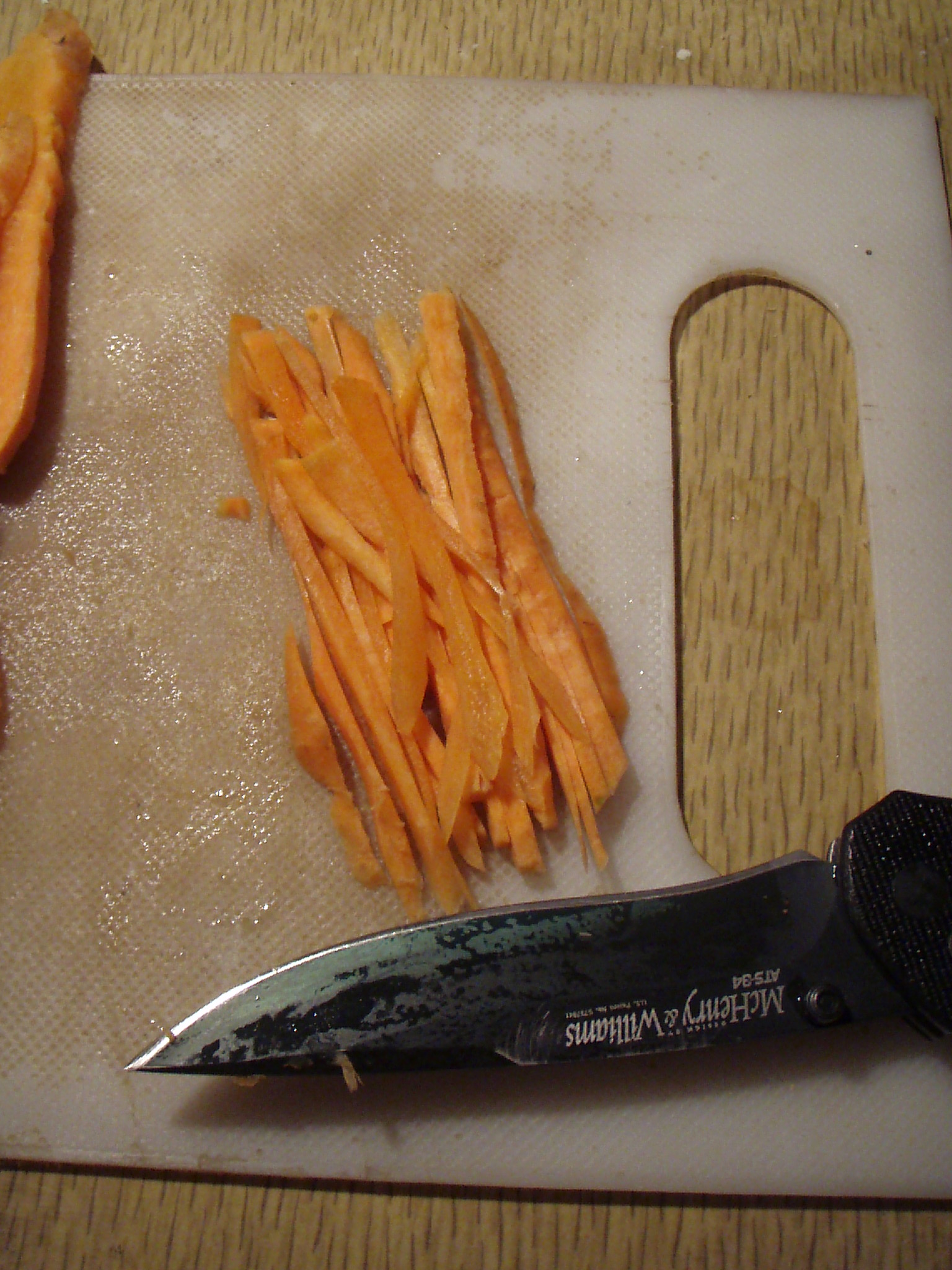 Нарезка морковки. Сначала рыжую пластаем: