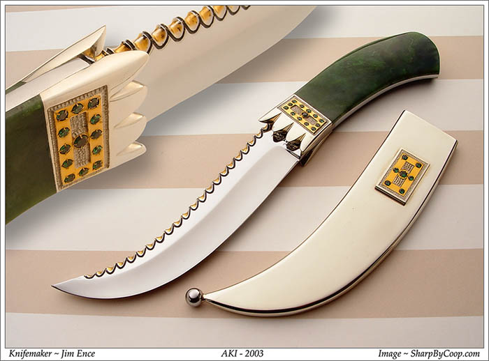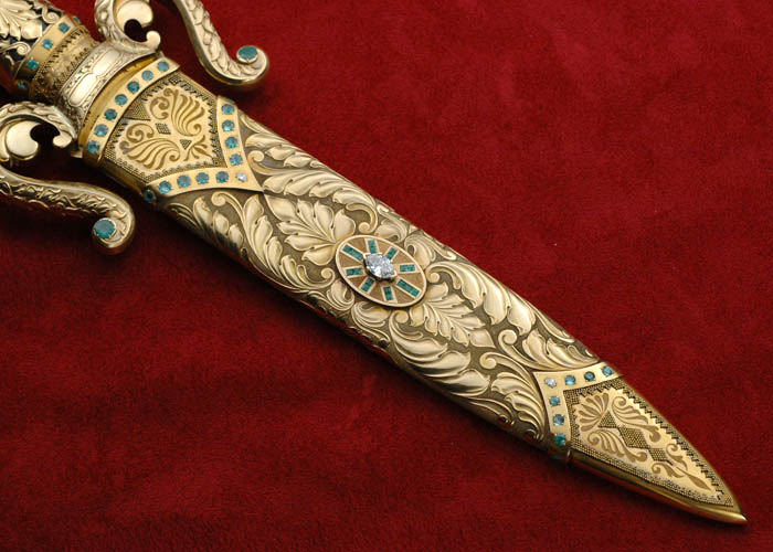Нож декорирован 153-мя изумрудами весом 10 карат, а также 9-ю бриллиантами весом 5 карат.