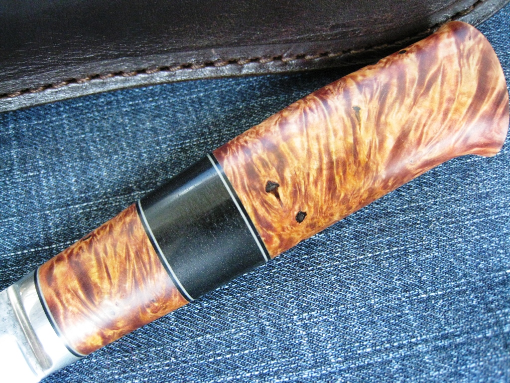 Вставки удобны при монтаже. Можно точнее сверлить отверстия под хвостовик и лучше подогнать - я всегда стараюсь не высверлить лишнее и подогнать поплотнее. Хотя, конечно, эпоксидка совсем не уступает по прочности дереву и на проблемы из-за, например, высверливания отверсий сверлом большого диаметра, никто, вроде, не жаловался. Ну а главное - мне нравятся вставки. :oops: Если честно, то, например, целиковые рукояти из карелки меня вообще оставляют равнодушным - ощущение, что впустую потрачено красивое дерево. Почему-то хочется акцент добавить. Целиковые рукояти из некоторых других пород выглядят интересно - например, всякие палисандры, кингвуд, железное дерево, может быть, зебрано (продольный распил), еще, наверняка много чего. Планирую попробовать в ближайшее время - все только откладываю каждый раз. Ну а вставка вплотную к больстеру была на моем предыдущем ноже (вернее, на нескольких предыдущих) - ну не знаю, мне кажется, такой вариант тоже имеет свои недостатки. Так что, о вставке совсем не сожалею. Единственно, может быть какая-нибудь бубинга или кокоболо смотрелось бы интереснее эбена - хотя с красным мог и перебор получиться. Ну а вообще, хорошо, что кап вышел такой удачный - что хочется больше. 8)