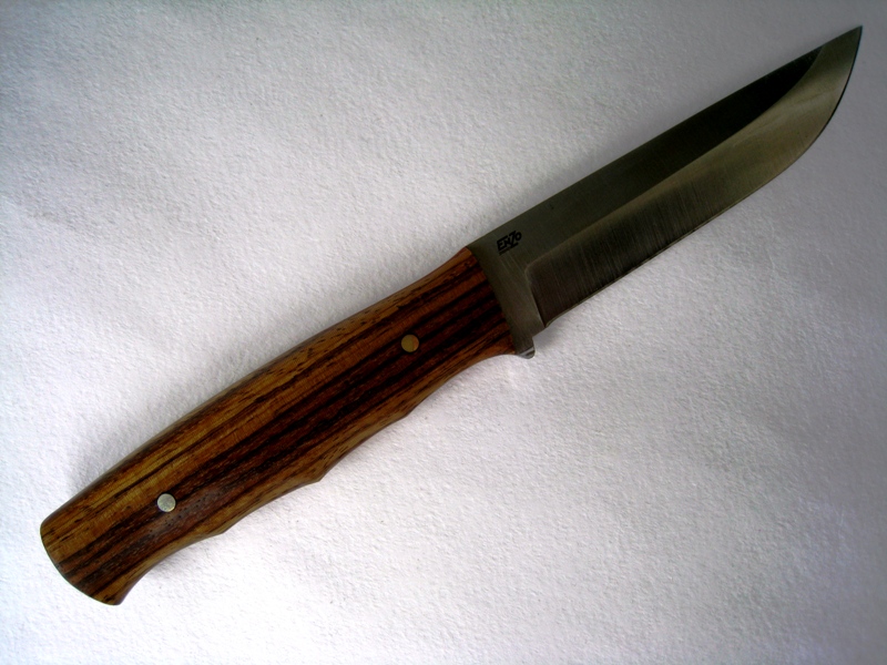 Клинок, очевидно, Энзо Кэмпер, как вот здесь: http://www.zadi.ru/product_info.php?products_id=22 Все параметры указаны довольно точно - сталь Д2, клинок длинна от рукояти до кончика ровно 125 мм (сам померял рулеткой), ширина 26 мм, толщина 3.5 - 3.6 мм. Довольно мощная штука, когда все в куче. У меня такой клинок был - я его хватанул, когда Энзо только начинал делать клинки из Д2. Пролежал он у меня на дальней полке довольно долго. При близком рассмотрении клинок мне показался узким и длинным (неправда, аптицкий обман зрения), ну и рукоять казалась немного несуразной (что, увы, правда). Очевидно, автор этого ножа думал так же, поэтому попробовал его затюнинховать - насколько это вообще возможно при подобной конструкции. Ну, навершие исправить получилось не очень. Хотя, глаз привыкает а рука вообще дискомфорта не ощущает. Передняя часть рукояти и брюхо довольно широкие, но благодаря форме накладок получается удобно для управления клинком и проблем с обхватом не возникает. Ну а благодаря довольно толстой рукояти возле навершия, хват весьма уверенный, не взирая на недоразвитый "грибок". Дерево на рукояти то-ли зебрано, то ли zebra wood - ну очень мне понравилось. Переливается слегка в зависимости от угла падения света. Темная полоса, идущая по центру то выделяется на фоне более светлых боковин, то светлеет и полностью с ними сливается. Это можно прямо на фотках увидеть - так как обе накладки выпелены из одного куска и полностью друг-другу соответствуют, разница в их виде (с полосой и без) проистекает именно из-за раазного угла падения света по отношению к их структуре. Такой же результат можно видеть на каждой из накладок по отдельности, если их поворачивать к свету. Как-нибудь сам попробую с таким накладками нож сделать - надо же когда-то сделать рукоять целиком из одной древесины, без проставок.
