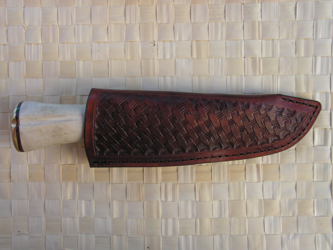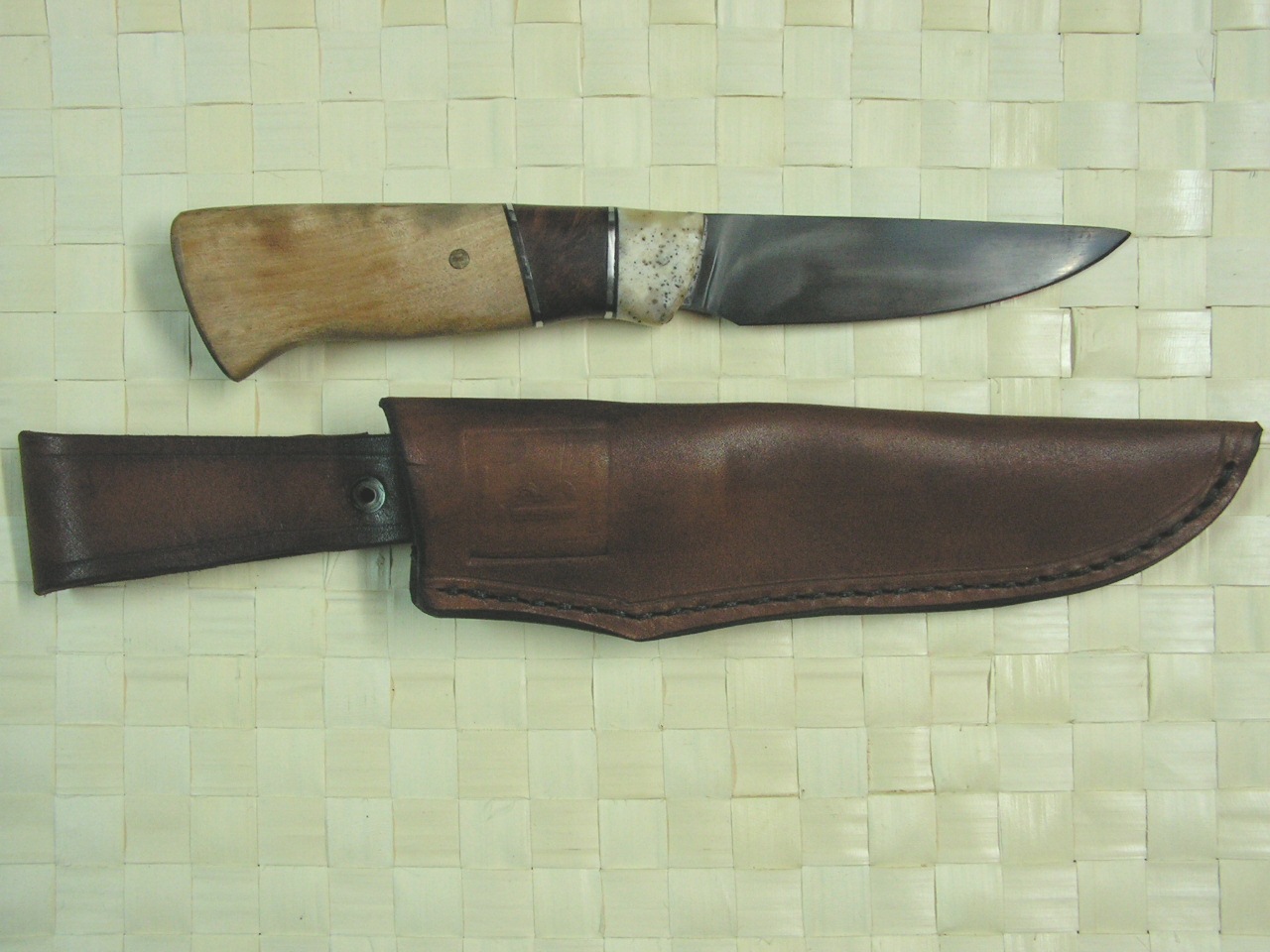 1. Якутообразный нож. Выкован из подшипника, дол прокован и затем фрезой несколько облагорожен. Заточка односторонняя, клин от обуха, толщина обуха 4мм. длина клинка 117мм. Рукоять - рог оленя, фибра, бук, пин - титан. Монтаж всадной на эпоксидку, внатяг. Общая длина - 222 мм. Ножны - дерево, обшитые кожей. Не вылизывал тщательно поскольку лениво, да и не вижу необходимости.