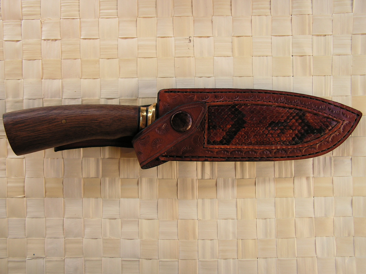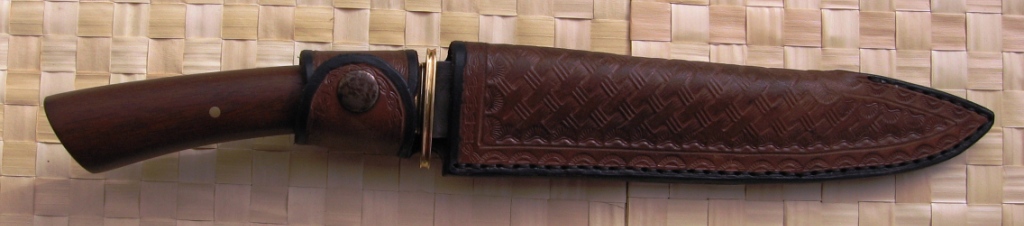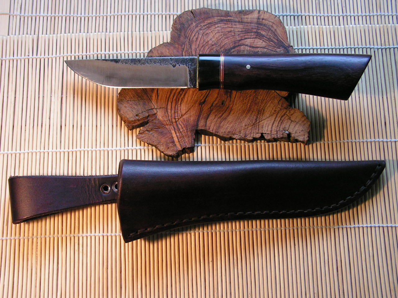 Клин-пружинная сталь, ковка, закалка-работа Руди Цирлина. 120х21х5мм, спуски прямые на 4/5 клинка, подводы к РК 0.2мм. Больстер: медно-латунное мокуме от BlackDog, фибра, латунь, бразильский орех, декоративный пин Руди Цирлина. Монтаж всадной на эпоксу с пином, сверху прикрыт декоративным. Ножны - кожа, подвес свободный.