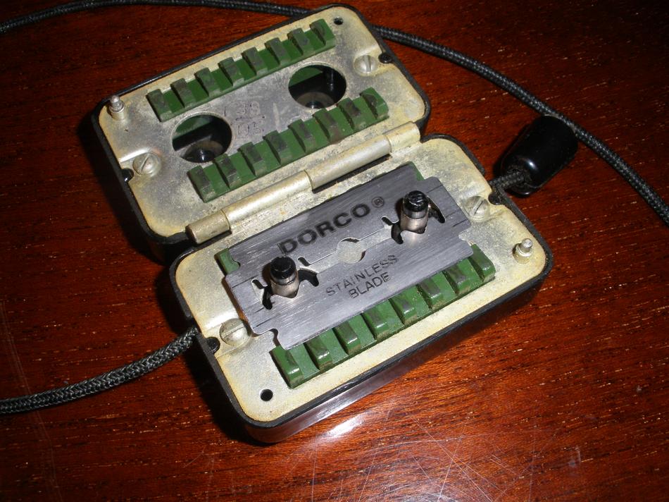 Сия механизьма предназначена для правки лезвий для безопасных бритв-станков.Принцип действия прост как сатиновые трусы-вкладываем лезвие в машинку,закрываем крышку и тянем верёвочку.Вот, собственно говоря ,и весь сакральный смысл.Внутрях чудо машинки лезвие ,надетое на направляющие колонки,под действием перемещающегося шнурка ,при помощи эксцентрика приходит во вращательное плоскостное движение,и трётся РК по зелёным алмазоабразивным подпружиненым подушечкам.То есть затачивается.Шнурок тянется в одну и в другую сторону,пару раз протянул,и снова можно бриться.А вот год выпуска и фирма-завод изготовитель ,для меня тайна покрытая мраком.Может у кого-то сведений побольше,поделИтесь.