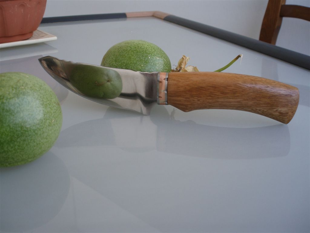 У моего Индейца появился единокровный брат . Его клинок сделан из того же полотна быстрореза .Честно говоря , делал его , чтобы скоротать время до появления нормальных клинков , и хотелось поставить мой первый сварной больстер из нержавейки и меди . Особенно не заморачивался , дерево - очередной бразильский орех , единственным достоинством которого является влагостойкость ( применяется для строительства пирсов и настилов на набережной ) . Просто несколько раз покрыл шеллаком . В руке сидит удобно , режет зверски .Сильно не ругайте :oops: