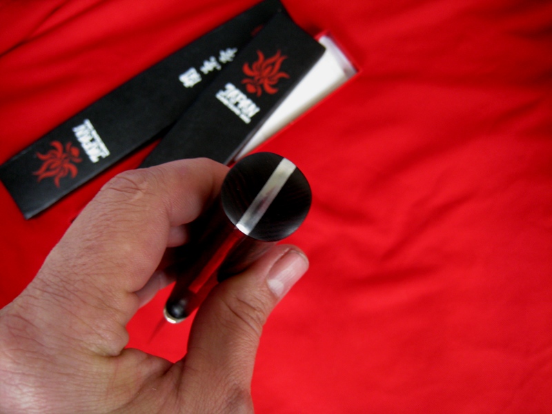 К ножу с клинком Канетсуне (голубая сталь, обкладки из мягкого дамаска) из темы "Попытка намбер три" сделал я комплект. Покупал в свое время два клинка, один пустил в дело и потом переделывал, а этот пролежал в коробочке на консоли в спальне три года - но вот и его очередь пришла. Тем более, что со стилем я определился, надо было просто сделать комплект...
