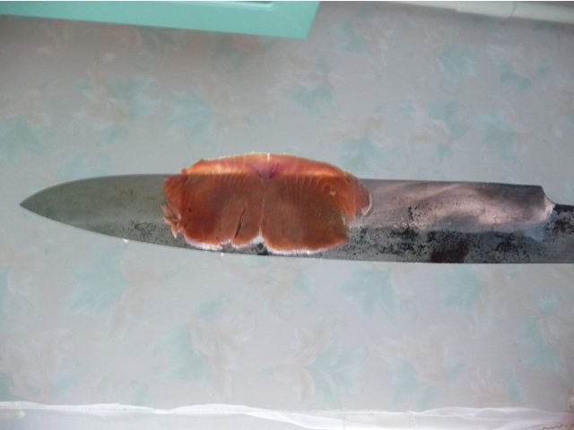 Подобно тестированию ножей на резке канатов, я хотел измерить ресурс этого ножа до полного затупления и умышленно не точил его месяц, хотя он заслуживал заточки уже после "кулинарного выезда". Честно скажу, для кухонников эта методика имеет смысл только при массированной загрузке за короткое время. Дома состояние "нож уже тупой, но еще режет" может продолжаться очень долго. Продукты же в основном мягкие и не абразивные. Поэтому полностью затупить об них хороший кухонник крайне затруднительно. Он будет резать за счет веса и сведения клинка. Тупить до конца его можно только об туши, мясо и сало в большом количестве.