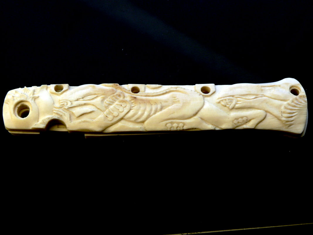 Делал хорошему человеку накладки на Ти лайт, нож ушёл, а пластмассовые щёчки остались. По ним вырезал из мамонта ужасти. Вот так и лежат, без клинка и без хозяина.