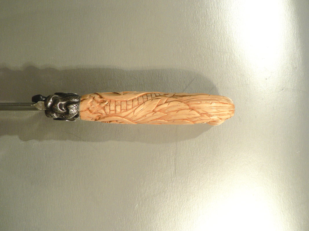 Я всего лишь выскажусь про цвет рукояти (остальное нравится). К общей стилистике более глубокий цвет кости нужен, почти коричневый или даже чёрный. Незнаю как это делается, но надеюсь без рисунка моя мысль понятна...
