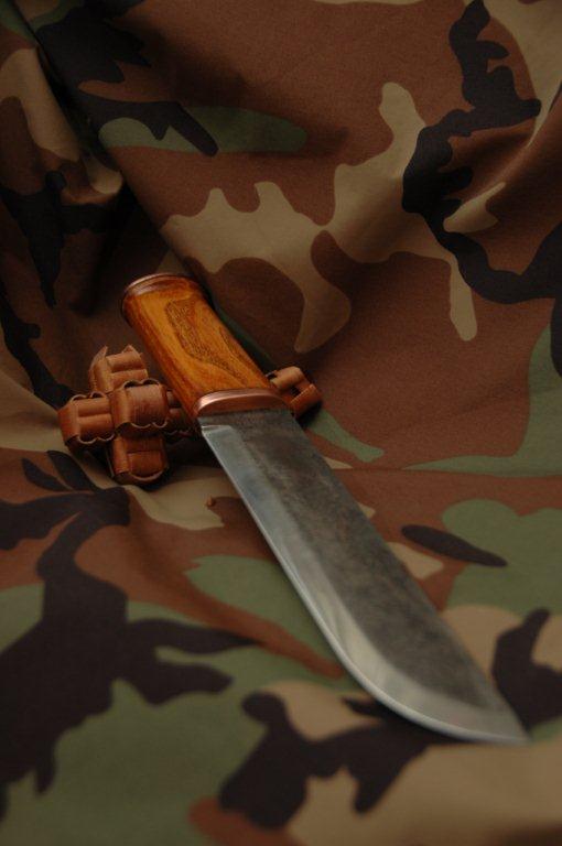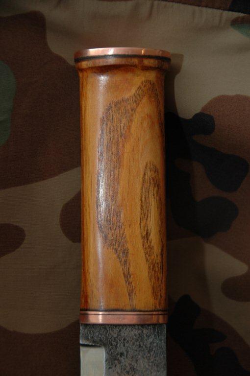 Здравствуйте! ЛЕУКУ-клин:шведский подшибник,закалка на 58-59\рукоять:медь,фибра,акация\монтаж:сквозной на расклёп+эпоксидка,тыльник на двух медных заклёпках!Ножен пока нет!