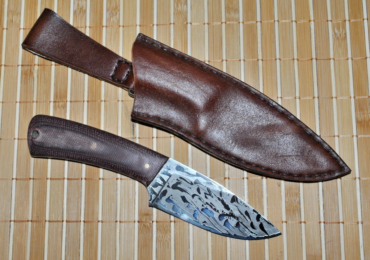 Нож крепок и надёжен. Я бы оставил клин серым без прибамбасов, смотрелось бы лучше а так пестровато. ИМХО. На предыдущем травление было в тему.