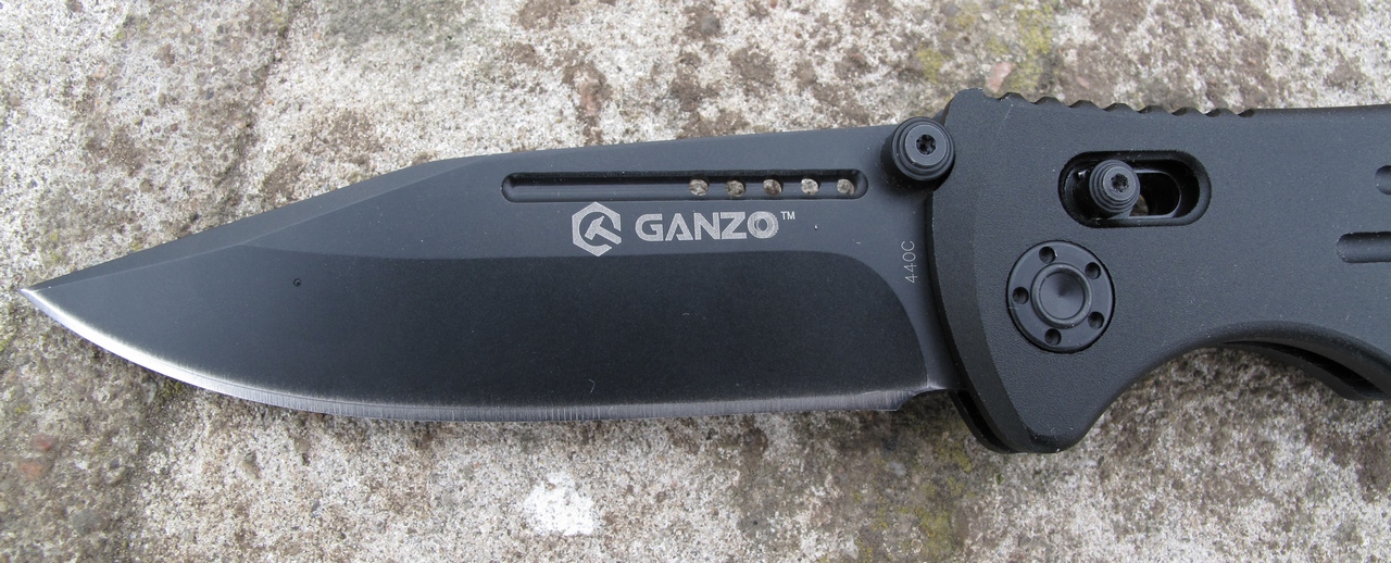 Сам клинок напомнил продукцию Microtech knives, продольный дол с пятью отверстиями ближе к шпеньку, очень похоже на Troodon combat, но всё же что-то своё. С левой стороны логотип производителя и маркировка стали 440С, справа пусто. Шпенёк двусторонний, имеет упор в торец рукояти при разложенном клинке, в помощь осевому винту при силовых нагрузках, тоже в стиле Socom Elite. При ширине клинка 26,5мм (в районе буквы О ) спуски шириной 15мм, это больше половины, буду надеяться, что рез особо не огорчит. Толщина обуха 3мм. Клинок drop point с небольшим намёком на фальшлезвие и длиной 84мм.