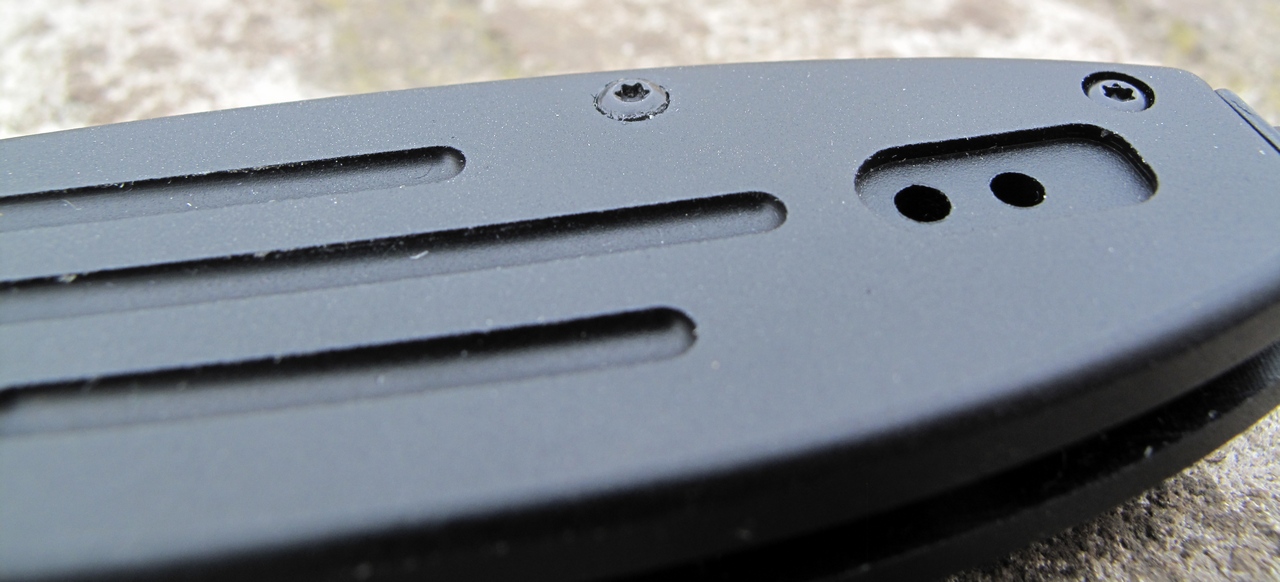 Монтаж рукояти заслуживает отдельного внимания. Ничего запредельного, но попробую описать. Внутри предположительно алюминиевых накладок, на глубину около 3мм от краёв вмонтированы стальные плашки-лайнеры, соединённые перемычкой в хвостовике. В эту перемычку вкручивается винт стеклобоя. Лайнеры утоплены заподлицо с накладками очень ровно, так что кажутся одним целым, двумя половинками рукояти. Эти половинки крепятся через две бонки в хвостовике и осевой винт, образуя сквозной монтаж.