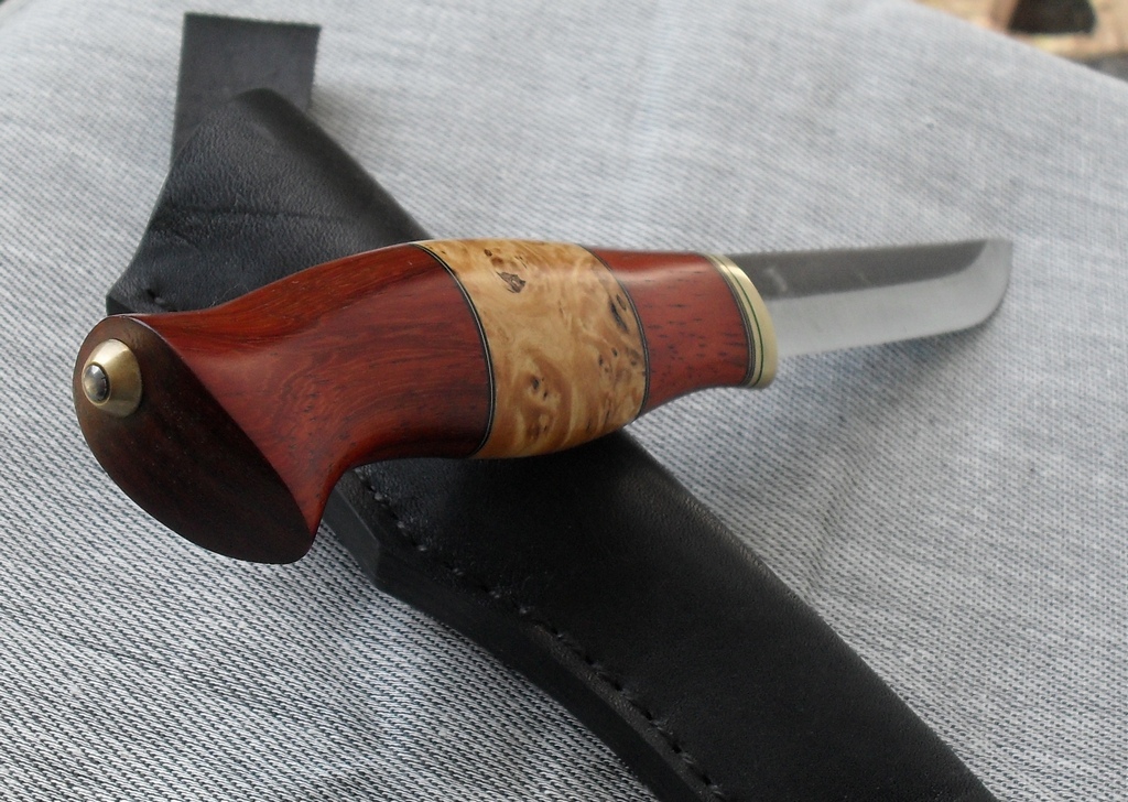 Что понравилось. вид сверху, подбор цвета матерьлов, чистая и аккуратная сборка, торец ножен аккуратненький, шовчик ровненький.